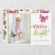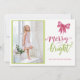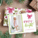 Finare söta moderna Merry- och Bright God Jul-hälsningar, kalligrafi- och handskrivet skript med ett vinterfamiljekort med säsong vinterjulkort mönster med hett te kopp, läppar och bovar i hallonrött, vitt, fern grönt och dammig rosa. Anpassa den med ditt foto (lodrät orienterat) och din text!