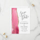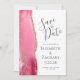 Det moderna bröllop spara datum-kortet från elegantens lämnat kant har en rosa vattenfärgsagat gräns som trimmas med faux guld glitter. Med anpassadet kombineras grått-handskrift, tryckplåt och kursivt typsnitt på vit bakgrund. På baksidan finns blanksteg för 5 foton (3 vågrät 1 kvadrat och 1 lodrät) och plats för webbadressen till bröllop eller annat kortfattat meddelande.