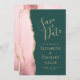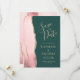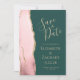 Det moderna bröllop spara datum-kortet från elegantens lämnat kant har en vattenfärgad rosa i gräns som trimmas med faux guld glitter. Anpassadet kombinerar handskrift, rityta och kursivt typsnitt med guld-färgad på en bakgrundsbild av grönten. Den omvända sidan har en passande och guld agate-design.