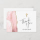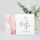 Tack vare det här kortet från den moderna första gemenskapen i elegant finns en rosa vattenfärgsagat gräns som trimmas med guld faux glitter. En liten guld faux foil kor visas över ord "Tack" i ett grått-handskriftsskript med kol mot vit bakgrund. Anpassadet innehåller ditt barns namn på framsidan och ett redigerbart meddelande på baksidan med kursiv stil. Idealisk för en flickas första gemenskap.