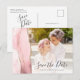 Det här vågrät i elegant sparar datumet för vykortet med en vattenfärgsagat i rosa gräns som trimmas med faux guld glitter. Ersätt enkelt exempelbilden med ett eget foto. Anpassadet kombinerar handskriftsskript och teckensnitt för tryckplåtar. Ett filter för vit övertoning hjälper till att få texten att dyka. Lägg till returadressen och ytterligare information på baksidan.
