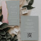 Den lämnat kant i eleganten med den moderna bröllopsinbjudan har en rosa vattenfärgsagat gräns som trimmas med faux guld glitter. Med anpassadet text kombineras handskrift, formatmall och kursivt typsnitt i vitt på blekens grönt. På baksidan finns utrymme för information om bröllop på en solid sage-grönt, tillsammans med en QR-kodgäst som kan söka på webbplatsen och OSAN, vilket sparar kostnaderna för utskrift och utskick av separat OSA kort.