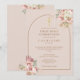 Vackra blomsterinspirerade pampasgräs vattenfarger med en chic guld båge ramar in detaljerna för första nattvarden i stilfull guld typografi på en mjuk rosafärgad bakgrund. Designad av Thisisnotme©