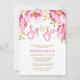 Eleganta rosa och guld flicka dryck och se inbjudningar. Designen har rosa vattenfärg blommor, falska guld glitter blad och ett modernt script teckensnitt. Designen är platt tryckta illustrationer/grafik - INTE VERKLIGT GLITTER.