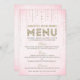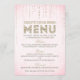 Den här vackra meny-kortdesignen av The Spotted Olive™ har en fin, mjuk rosa bakgrund med en bild av glittrande ädelstenar som strömmar från toppen och ordet "Meny" stilfullt typ satt med ordet "Meny" utfyllt med en bild av guldglitter. OBS: DENNA DESIGN HAR ENDAST EN UTTRYCKT BILD AV GLITTER; DET FINS INGET FYSISKT GLITTER SOM ANVÄNDS ELLER INGÅR; DET FINS INGA UTSMYCKNINGAR.