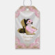 Flickor duschpresenter med söta flicka, med en rosa och en pärlsträng i sitta på ett par högklackskor i finare guld på rosa och guld med snurrande bakgrund. De här märkrna för söta babyduschpresenter är lätta att anpassa med din text. Det är en tryckt design utan äkta glitter, pärlor, satäng osv.
