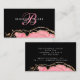 Ett unikt svartfärgat affärskort med rosa marble och guld foil agate geode design för en hårstilist, med ett inledande elegant och sans serif typography namn och title.
