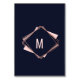Elegant, chic och modern med en retro-vib, falskt tryckt rose gold geometrisk diamantformad kontur på marinblå, mauve och rosafärgade diamantutskärningar, bordnummerkort för bröllop. Denna klassiska och sofistikerade design är perfekt för det stiliga, trendiga bröllopsfirandet. Anpassa med anpassade bordnummer på framsidan eller lägg till ett eget personligt meddelande genom att klicka på "anpassa"-knappen. Lägg också till din egen anpassade monograminitial på baksidan. Allt är foto-printdesign.