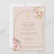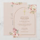 Vackra blomsterliknande pampasgräs i akvarell och chic guldportal ramar in dopdetaljerna satta i modern typografi på en rosafärgad bakgrund och din QR-kod på baksidan. Designad av Thisisnotme