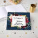 Utformningen har en mörk marin botten av blått lingstall av trä som dekorerats med en elegant blommigt av blommor av peony ro, eucalyptus greenery med mera i burgundsnyans, Marsaladött, maron, rosa osv. Utformningen har också ett utskrivet guld färgad gräns under blommigtens andetag för ett modernt utseende.