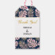 Rosa och guld-tropiska löv: Pnavy blue bröllop Tack presenter märkre. Denna vackra utformning visar löv av Split Löv Philodendron (Monstera deliciosa) eller Swiss Cheese Plant och handflatan löv i rosa med guld-kontur på marinblått. Er text är i ett vitt ram med guld kontur.