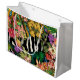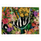 Söt rosa-daisy, frisier med ljusstark gult och mörk grönt löv i handflatan dekorerar ett brett diagonalband av svart och vitt zebra tryck och en gult och turkosa indiskt tryck. Resultatet är en tropiskt kollage av blommigtar som kommer att lägga till en dramatisk popning av färg.