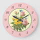 En väggklocka med rosa och gul ros från botaniska vintagar med blå fjärilar på en faux parchment bakgrund och antiktal i svart på rosa.