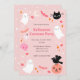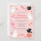 Inbjudan gäster till din halloweendräkt party med den här söta inbjudan. Utformningen har pumpor, svart katt, sött spöke och dubbelfärgade gnistor och andra tecken på säsongen allt i en vänlig rosa. Anpassa med din egen namn & party-information!