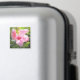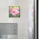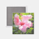 MaeFlowers originalfotografi på detta Magnet visar en rosa hibiscus blomma på morgonen mot bakgrund av grönt löv. En av blompetterna, fortfarande i skuggan, har regndroppar på den från en dusch på morgonen i tidigt. Skjutorna av nyp och gröntar skapar ett vackert trädgårdsklimat.