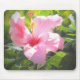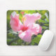 MaeFlowers originalfoto på den här musmattan har en rosa hibiscus blomma på morgonen i solljuset mot bakgrund av grönt löv. En av blompetterna, fortfarande i skuggan, har regndroppar på den från en dusch på morgonen i tidigt. Skjutorna av nyp och gröntar skapar ett vackert trädgårdsklimat.