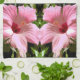 Ljusa rosa hibiskusblommor är subjekt av detta tropiska trädgårds- mönster med en blom-" look "för land. Det finns härliga fyra, brett öppnar blom som inåt vänder mot från varje, tränga någon. Blommapetalsna är ett mycket djupt - rosor i centrera som behagfullt yttre buktar, som petalsna ändrar till en mer ljus rosafärg. Bakgrunden är ett mönster som göras upp av, skuggar av naturlig grönt i växt löv. Denna är en original- design som göras från ett original, fotograferar.