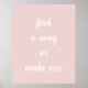 En inspirerande poster med frasen "hitta ett sätt eller göra ett". Ord grundar sig på ett citat som tillskrivs Hannibal, en militär befälhavare för den gamla artonen, en av Roms underbarare motståndare. Uttrycket kommer att uppmuntra er att övervinna hinder som står i vägen för er. Det påminner oss om att aldrig nå ge och att nå våra mål med orubblig beslutsamhet. Den vita texten ställs in mot en rosa-bakgrund. Motiv och snyggt väggkonst.