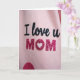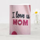 Det här kortet visar en intim närbild av en mjuk rosa pastellfärgad tygyta som känns som en mysig souvenir, med ett sött, hjärtligt budskap som lyder “I love u MOM” ❤️. Den övre texten, “I love u,” sitter nära toppen i flytande svart bokstavsstil som kontrasterar skarpt mot den milda rosa färgen. Den ser lite upphöjd ut, som om den är stygnad eller lager på lager, vilket ger ett varsamt och omsorgsfullt intryck, som om någon tagit sig tid att göra den speciell. Nedanför står “MOM” i större storlek och centrerat, med varje bokstav överdragen med fuchsia-glitter som fångar ljuset som en liten fest. “O” blir en rund glitterring som vaggar ett litet vitt hjärta i mitten, vilket antyder en varm kram i visuell form. Bakom bokstäverna visar tyget en svag diagonal