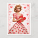 Skicka lite romantik på gammaldags vis med detta charmiga vintage-Valentinskort. Med en klassisk illustration inspirerad av 1950-talet av en glamourös kvinna i en rosa hjärtmönstrad klänning som mjukt håller ett prickigt Valentinskort-hjärta, fångar denna design tidlös femininitet och nostalgisk kärlek.