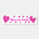 Rosa hjärtan, två större på ändarna och nio mindre på och under texten, Du är älskad, trycks på stötfångare. Texten är också rosa och bakgrunden är vit. Tack för att du handlar på PositiveAffirmation på Zazzle.