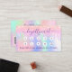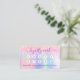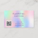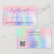 En holografisk bakgrund med enmajsfärg och regnbåge färg i rosa, lila, myntgrönt. Dekorerad med droppar. På framsidan: Lägg till rabatt. Tillbaka: Anpassa och lägg till namn, titel, mobilt nummer, e-post, webbplatsadress, qr-kod på webbplatsen. Lila brev. Utan glitter på baksidan.
