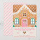 Denna inbjudan till pepparkakshus-fest har ett festligt pepparkakshus dekorerat med rosa, grönt och vitt. Koordinerar med pepparkakstemat. Du kan redigera för att inkludera alla roliga detaljer för din fest. Baksidan har ett rosa och vitt diagonalt randmönster.