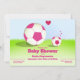 En fotboll-/fotbollbaby showerinbjudan. Inbjudan visar en rosa fotbollboll och en rosa bebisfotbollboll, gröntgräs och en blå himmel. Alla av ord kan skräddarsy.