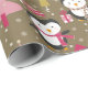 Denna vackra julomslutning papper är perfekt för antingen en pojke eller en flicka. Den här konstruktionen har en brun bakgrund där snöflingor faller. Späd små penguiner med vinterhattar som håller presenter med rosett band medan de dansar runt rosa och grönt Julgranar. En sådan underbar presentfigursättning för barn.
