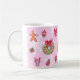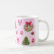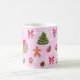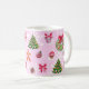 Rosa mugg med snöflingor, pepparkaksgubbar, andedräkt, presenter, poinsettias, bokor, muffinsar, prydnadsföremål.