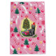 Snygg, lekfull, glad juldesign i rosa med en illustration av en svart katt med Julgran och mönster som flyter runt.