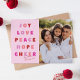 Ett modernt, djärvt och färgstarkt julkort i rött och rosa med ord, "glädje, kärlek, fred, hopp, glädje". Kortets baksida har plats att ange ditt eget meddelande.
