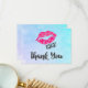 Ett tackkort med rosa Kissy läppar och texten "xoxo!". Ställ in på en turkos blå vattenfärgsbakgrund.