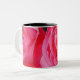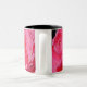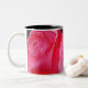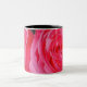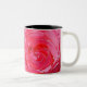 MaeFlowers originalfotografi på Mugg är en förslutning av två ljusa rosa som klättrar ro, färska från trädgården. Ro-petalerna, i ljus och skugga, är många skuggor av rosa, från blek till djup. Ett ro ansikte direkt visar pepparspetsen när de går runt till mitten. Den andra ro, bredvid och strax bakom den första, vänds lite åt sidan. De vilar på en lätt texturerad grått yta, mot en svart bakgrund.