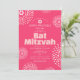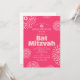 Var stolt, gläd dig och visa upp denna milstolpe för din favorit Bat Mitzvah med denna roliga, trendiga, groovy, personliga inbjudan! Retro vita och rosablommiga stjärnexplosioner med Davidsstjärnor, samt modern fet rosafärgad och vit sans serif-typografi, överlagrar en ljus korallrosa bakgrund. På baksidan finns ett foto som du väljer och en korallrosa blommig stjärnexplosion som överlagrar vitt. Anpassa den anpassade texten med din Bat Mitzvahs namn, hebreiska namn, datum, lokalinformation och foto. Garanterat att tillföra stilfullt kul till hennes speciella tillfälle!