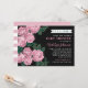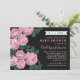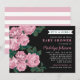 Denna slående baby shower-inbjudan har en fet "It's a Girl!"-text ovanför en dramatisk blomsterillustration av djuprosa trädgårdsrosor med rika gröna blad mot en stämningsfull svart bakgrund. Den skrivna "Baby Shower"-texten och hedersgästens namn är markerade i ljust rosa för en elegant, iögonfallande look. Ett koordinerande rosa och vitt randmönster klär upp baksidan av kortet. All text är helt anpassningsbar för din fest.