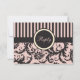 Detta stilrena och trendiga rosa, kräm och mörkt kolgrått randiga blomster-damask RSVP-kort matchar den bröllopsinbjudan som visas nedan. Texten och pappersvalet är anpassningsbart. Om du behöver ytterligare matchande artiklar, vänligen maila niteowlstudio@gmail.com med din förfrågan.