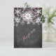 Det här festliga och trendiga svart-vita kritskriftskortet för svar på bröllop har lager av ljusrosa och vita snöflingor som matchar vinterbröllopsinbjudan som visas nedan. Det skulle vara perfekt för ett vinterbröllop, julbröllop eller bröllopsfest, en vinterjubileumsfest eller en vinterbal eller annan evenemang. Här visas det på vanligt papper. Det är lätt att anpassa med din egen information. Det finns anpassningsbar text som du kan redigera som du vill. OBS, notera att allt kommer att skrivas ut som det ser ut på din skärm. Zazzle kommer inte att redigera någonting för stavfel eller felaktig justering etc., och jag kommer inte att se det när du har beställt det. Om du behöver hjälp med din formulering, vänligen maila mig INNAN du beställer. Om det finns andra