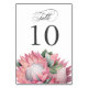 Ett vackert kort för bordsnummer av elegant för bröllopsmottagningar, banketter och firande, den här designen har en botanisk bukett av exotiska blommar av vattenfärgen Kung Protea. Om du vill anpassa dig efter bordsnumren redigerar du bordsnumret och lägger till i kundvagnen. skapa sedan nästa bordsnummer-kort genom att redigera bordsnumret igen för nästa bord och lägg sedan till i kundvagn. Upprepa stegen för varje bordsnummer.