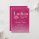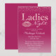 Denna anpassade evenemangs inbjudan har en Damernas kväll festtema på en het rosa bakgrund. "Damernas kväll" är tryckt i en glamourös rosa glitter och folie stil font. Ett par läppar i en kyss markering placeras bredvid "kväll". Rosa glitter damm accentuerar delen ovanför ordet "Damernas".