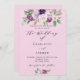 En rosa bakgrund. Dekorerad med lila vattenfärgade blommor och grön. Anpassa och lägg till information om namn och party. Tillbaka: Lägg till webbadressen för bröllop i QR-koden för mer information.