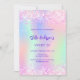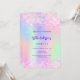 En girig och femininin Sweet 16-parters inbjudan. Framtill: En regnbåge, holografisk färgad med bakgrund i lila, rosa, myntgrönt. Dekorerad med rosa-konfetti. Anpassa och lägg till information om namn och party. Namn är skrivet med ett handskript stil, lila färgad brev.