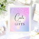 Skicka dina gäster till presenten bord med det här snyggt-tecknet som innehåller en övertoningsbakgrund för rosa och lila glitter med holografisk övertoning. Perfekt för att skapa ett kohesivt tema och elegantens dekortema vid möhippan.