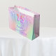 En presentpåse för en girig och glamorös Quinceañera, 15:e födelsedag. En holografisk bakgrund i rosa, lila och mint grönt med konetti. Nummer 15 skrivs med ett stil-teckensnitt med ballong. Perfekt som en festväska eller som en presentväska.