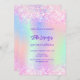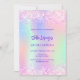 En girig och feminin Quinceañera-inbjudan. Framtill: En regnbåge, holografisk färgad med bakgrund i lila, rosa, myntgrönt. Dekorerad med rosa-konfetti. Anpassa och lägg till information om namn och party. Namn är skrivet med ett handskript stil, lila färgad brev.