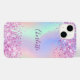 En holografisk trendig med enmajs och regnbåge pastel färg i rosa, lila, mynta grönt. Dekorerad med konetti. Anpassa och lägga till ett namn, skrivet med ett modernt handskript i stil