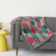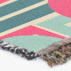 Kastfilten har en modern design i mitten av århundradet av upprepade rektanglar i rosa, teal och blått med cirklar som är översta.