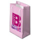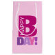En gigantisk rosaftig Grattis på födelsedagen-presentväska med ord "Lycklig Bday!" i olika skuggor av rosa och lila.
