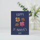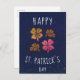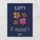 Rosa lycklig Shamrock-klöver Glad St. Patrick's day vykort. St. Patrick's day-kort. Fyra shamrock på marinblå bakgrund. Klöver med fyra blad för tur.