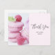 Tack-kort med en läcker fotografering som visar ett torn av rosa macarons med hallon placerade runt omkring. Förtjusande gudomligt.